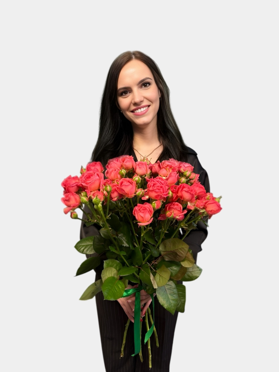 Условия доставки товара "Букет из 7 коралловых кустовых роз с атласной лентой"
