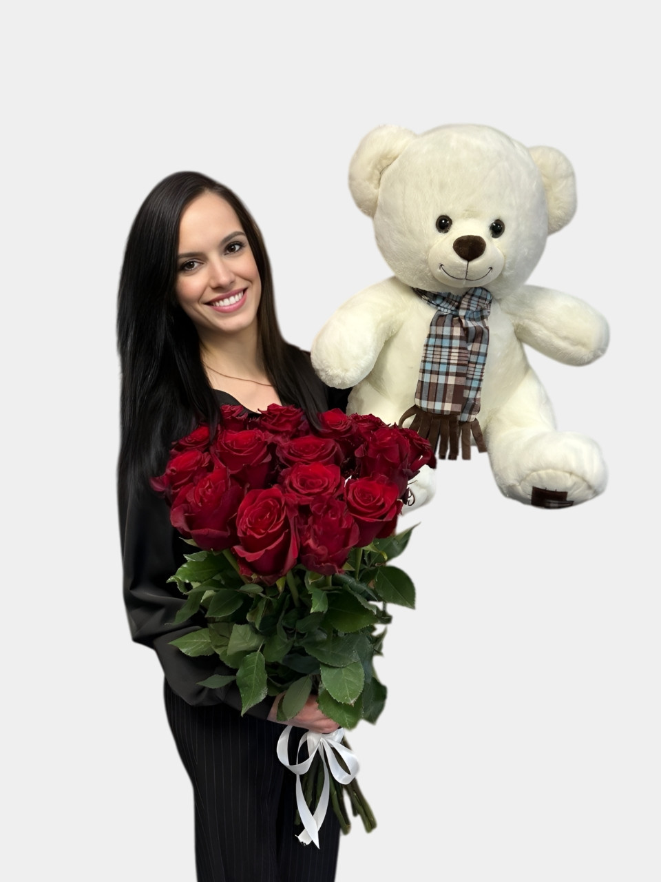 Розы с мишкой подарили мне на ДР. Цветы были свежие, стояли больше недели. Мишка мягкий, теперь украшает мою комнату. Очень приятный и душевный подарок!