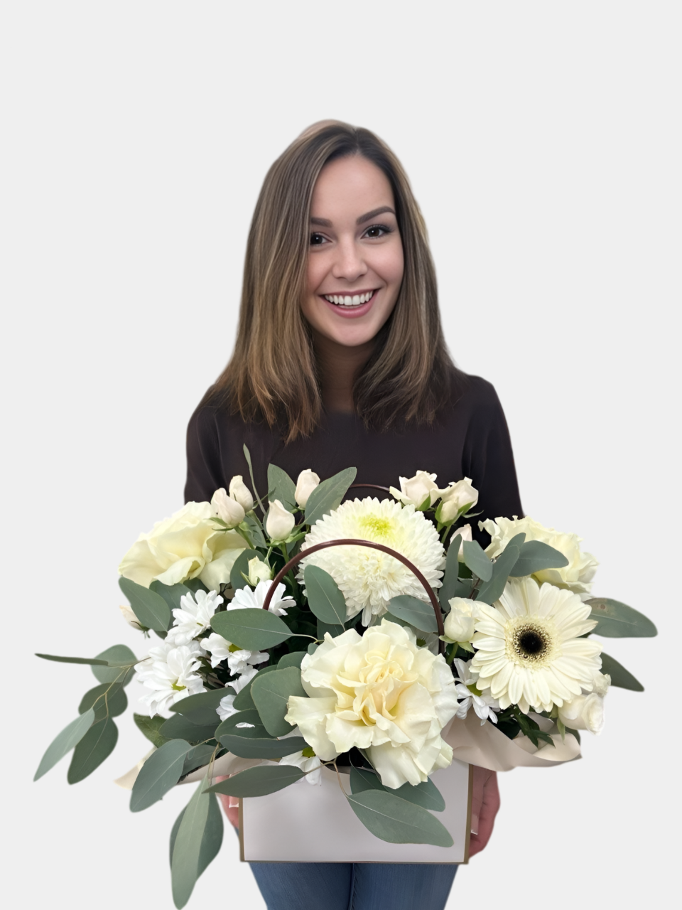 Композиция удивила — красиво, лаконично и очень гармонично. Особенно порадовало, что разные цветы сочетаются так мягко. Эвкалипт добавил свежести, будто немного природы взяли с собой.