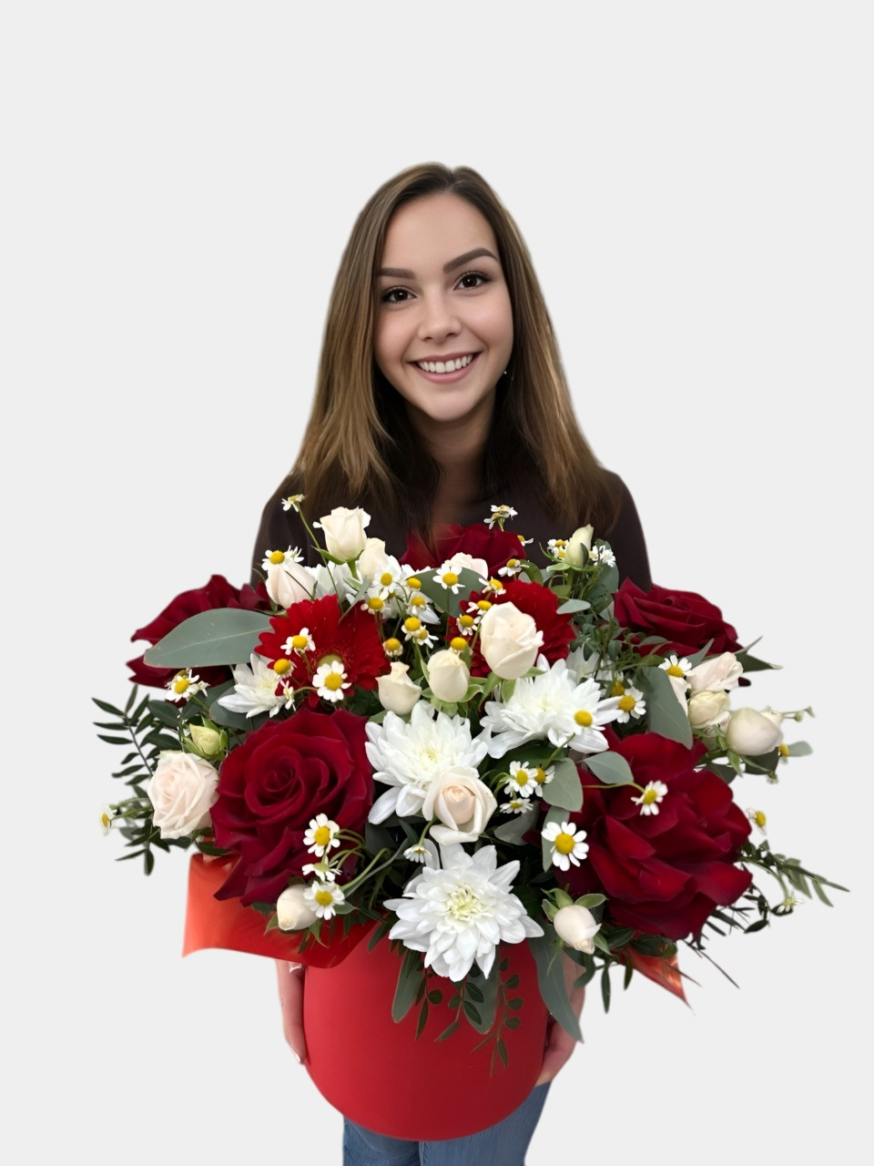 Композиция в красной шляпной коробке просто чудо! Красные и белые цветы красиво сочетаются между собой, выглядит стильно и аккуратно. Заказывала маме, она была в восторге. Особенно понравилось, что коробочка не требует вазы — очень удобно